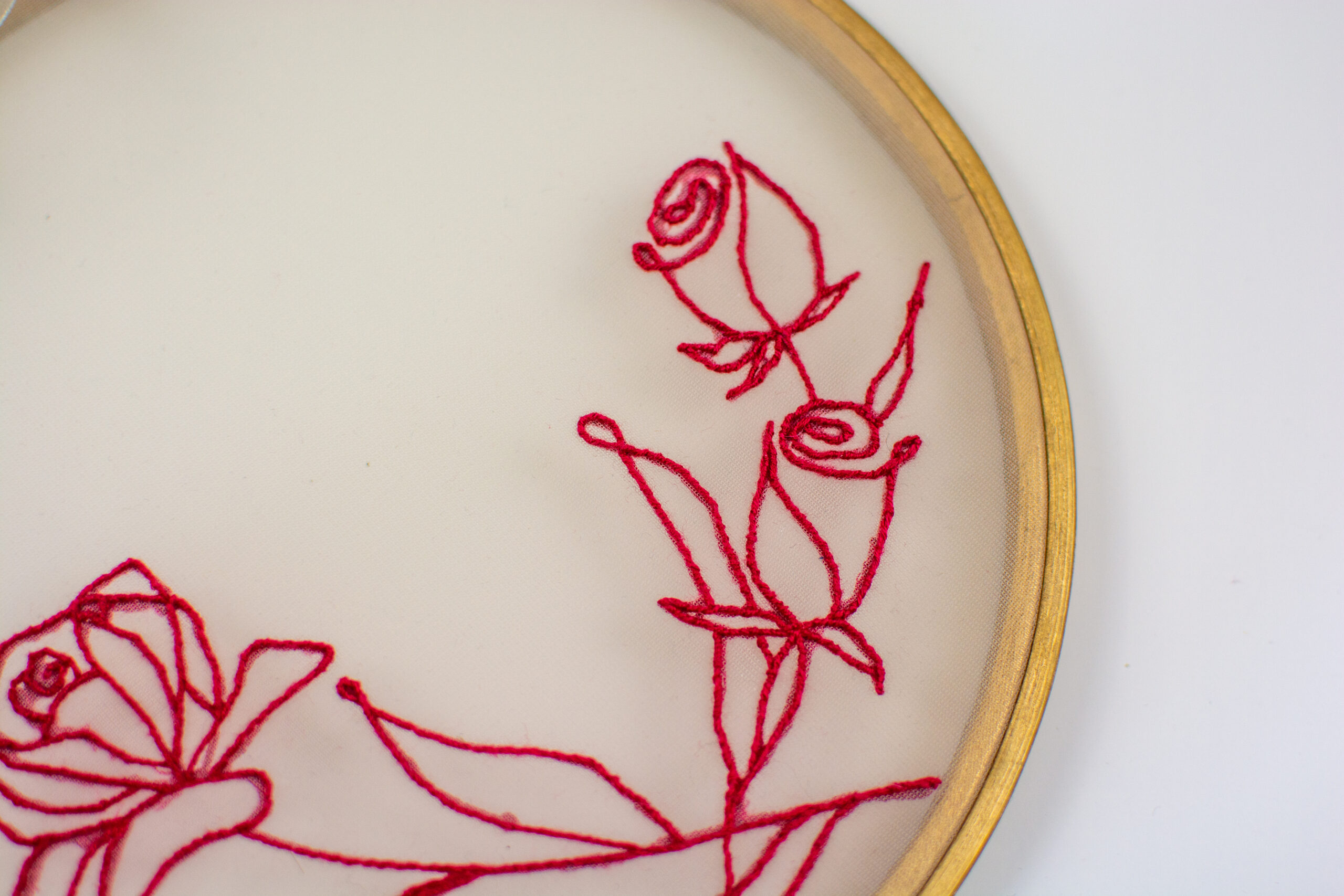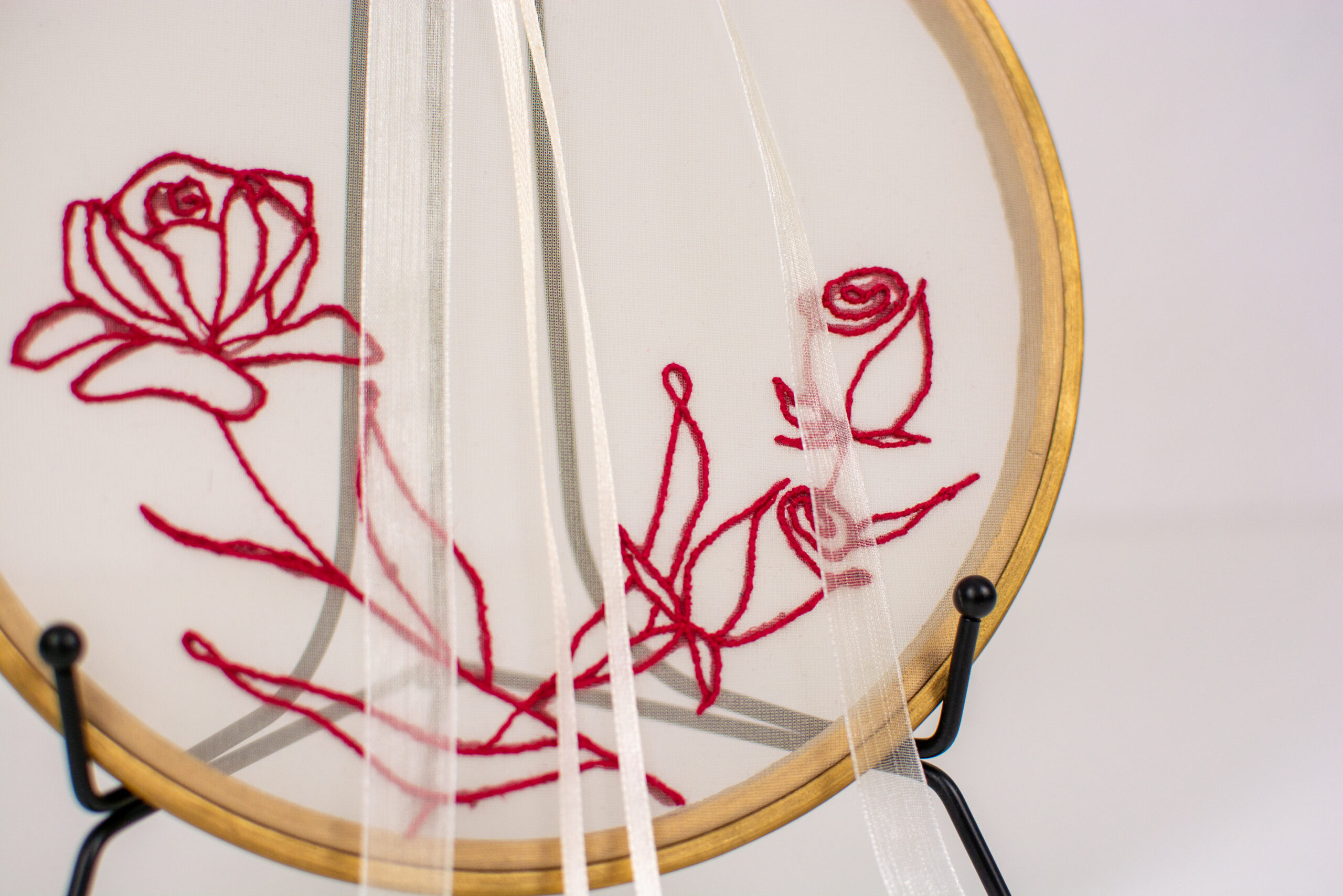 Hauchzarter Organzastoff, handbestickt mit einem Rosenmotiv in magentarot.